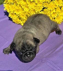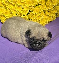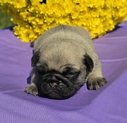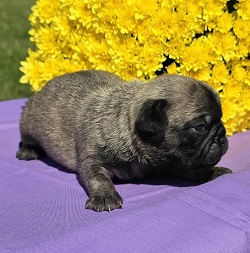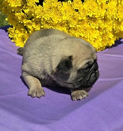 All puppies will have a Neopar vaccination at 4 weeks and 1st 5-way combo puppy vaccination at 7 weeks. They will be dewormed 3-4 times before leaving. They will be vet checked between 7-8 weeks old, our vet does a thorough examination and complete fecal checking for Worms, Coccidia and Giardia. Puppies are microchipped before leaving. All Pug puppies' dewclaws will be done unless new owners request differently before the puppies are 3 days old, which is when dewclaws are done. Per state law no puppies will go to their new homes before 8 weeks old. A non-refundable deposit is required to hold your puppy until it is 8 weeks old and ready to leave. Deposits are $300-$500 with remaining balance due at time of pick up. All Pug puppies are started on Diamond Naturals Small/Medium Breed Puppy Food. When food is first introduced it is soaked in goats' milk, with Canine Complete Enhanced Multivitamin added. Once puppies are weaned from mom, they will have free choice kibble (dry food) and twice a day will have soaked food. By 8 weeks old most puppies will be on straight kibble and not need soaked food anymore. All puppies are started on litter box training between 3 and 4 weeks old. We use corncob bedding pellets most of the time, if those are not available we use hardwood fire pellets or alfalfa pellets for the litter. These smell like outdoors and puppies are naturally drawn to them. This is very easy for new owners to set up in their own homes and puppies transition very easy to pottying outside with this type of training.